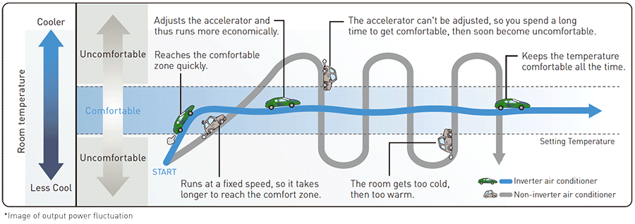 Panasonic’s inverter provides optimum power control and extremely efficient operation by changing the power supply frequency. The reto avoid unnecessary electricity consumption. Conventional non-inverter air conditioners can only operate at a constant speed, switching the compressor ON and OFF to maintain the set temperature, which wastes electricity.